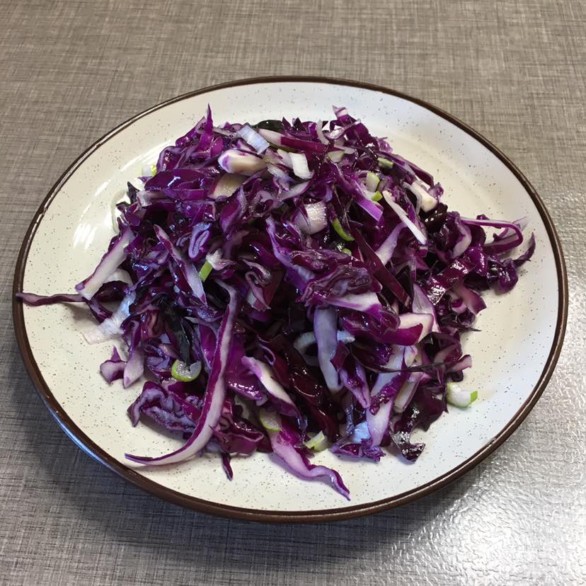 橄榄油拌紫甘蓝,紫甘蓝切丝后,用盐腌制片刻后,加入纯净水过滤,沥干水分放入橄榄油拌匀即可,放点葱末更好吃😋