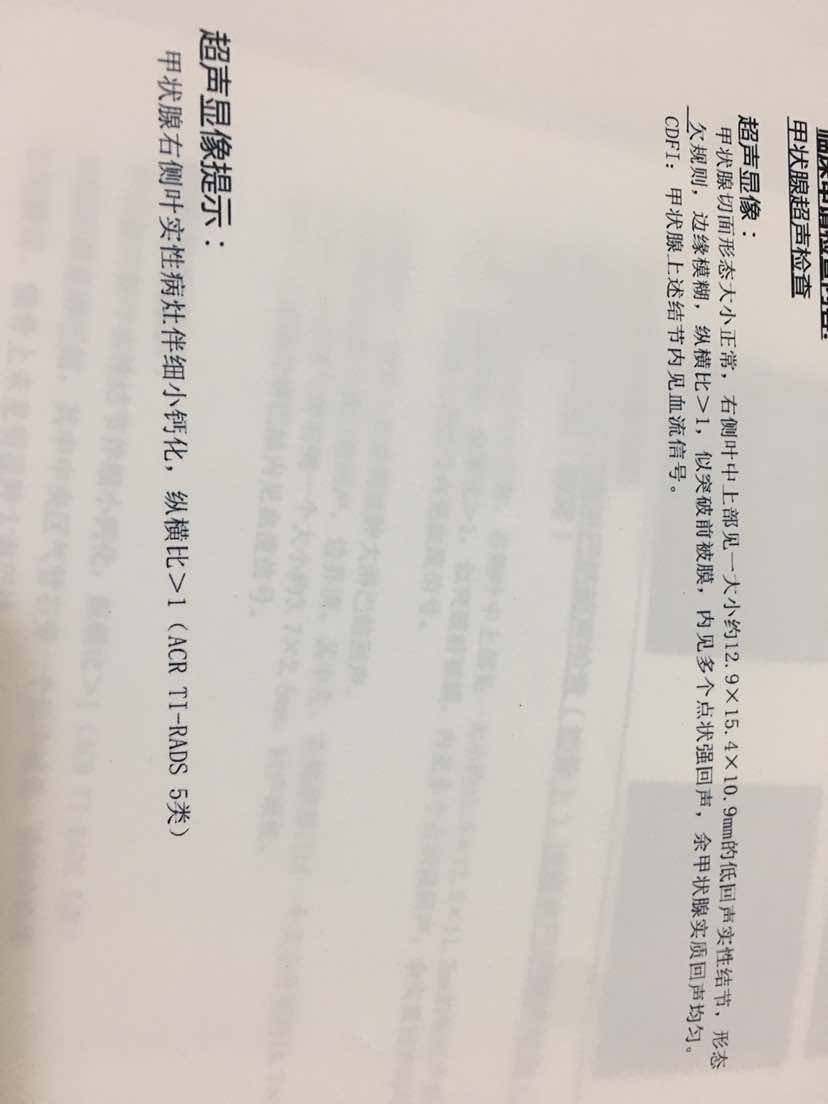 1月4号,又去门诊开住院证,我把我CT的结果给她,她说你这个肺部没什么事呢,甲状腺要查一下。然后给我开了甲状腺彩超的单子,(当时我还不以为然,我就想结节不是谁都会有吗?)然后检查甲状腺的时候,正是他们在教学,彩超医生说那要做手术。我听见了心里一紧。做完慌慌的出来了,拿到单子上面写着5类。风湿科医生看了说你赶紧去乳甲外科叫他们跟你加个号,你这个恶性程度很大。我就去乳甲外科,刚好有个教授刚好看完,我说我要加号,他说你什么情况,给我看一下,我把彩超给他。我问他严不严重啊?他说你就算是恶性切了就没事了。然后说你有两个方案,保守点先穿刺看结果,也可以直接手术,术中快速冷冻看结果。