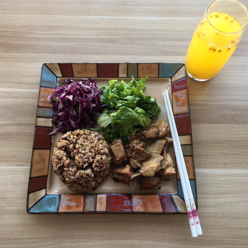 早餐:紫甘蓝、生菜,小笨鸡,杂粮饭和百香果