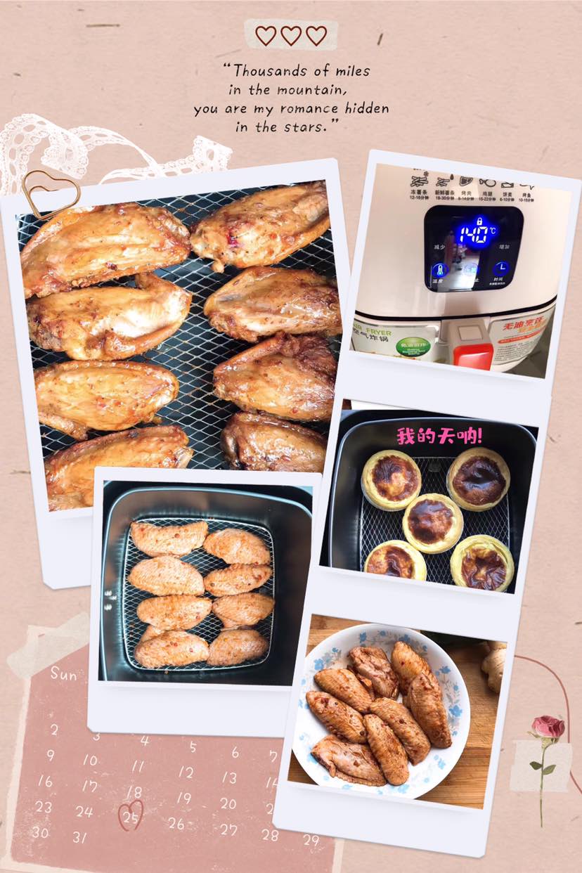 新入手空气炸锅,一时半会摸不准这家伙的脾气😕烤个蛋挞,我的天呐!一大早的就给我颜色看😡180度8min就翻车了🙈这还没按说明书上“200度10min左右”呢😂早饭后立马买了鸡翅,码味一上午,中午继续进锅~姐还就不信了,都落姐手里了还有玩不转的……没放一滴油,熟了之后不是那种油汪汪的~就这样被我征服😛😝😜😋