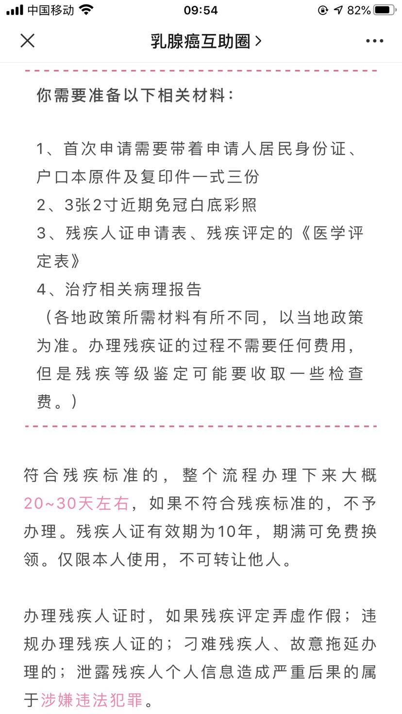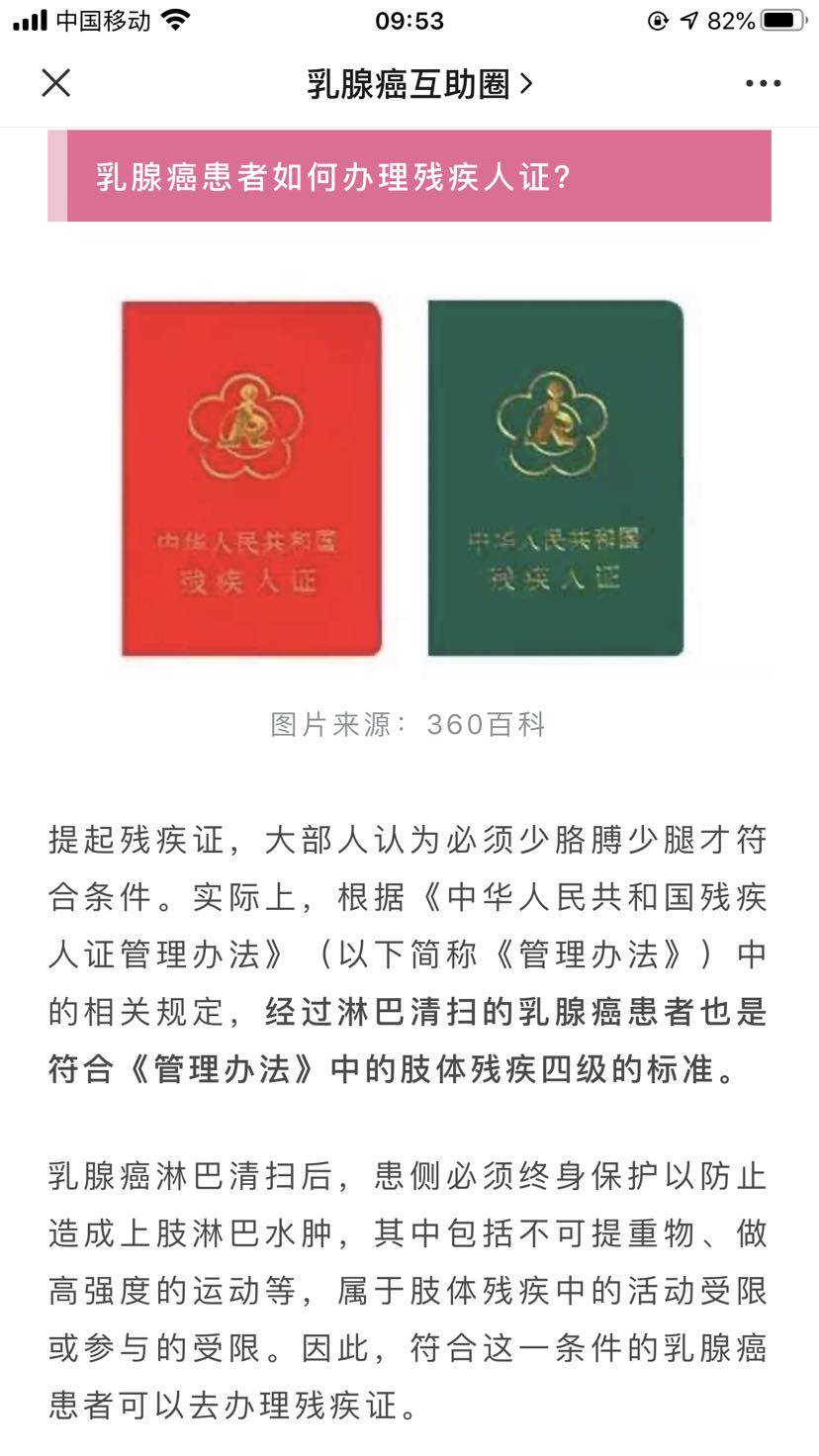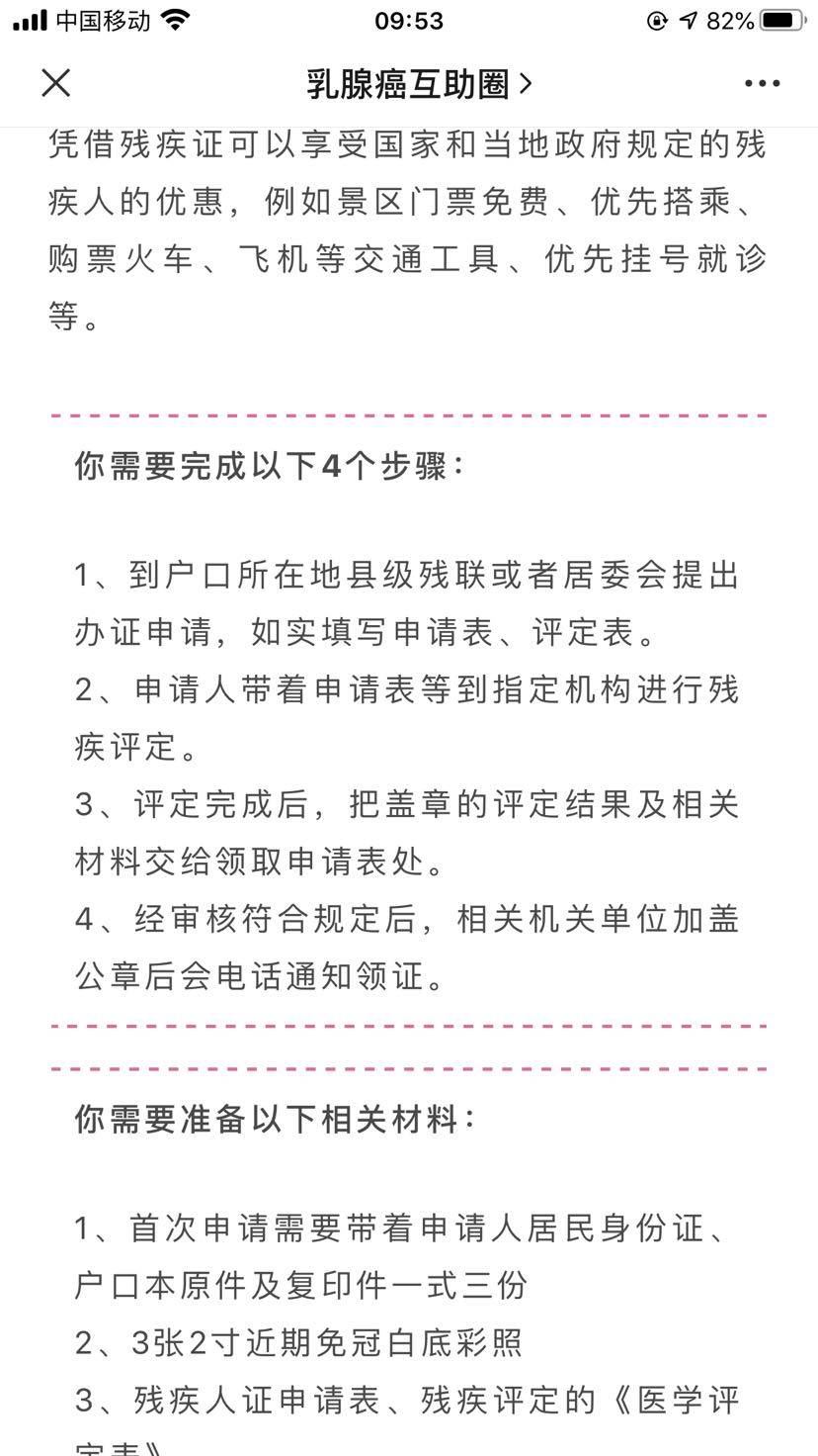 年前就通过一些乳腺癌科普文章了解到像我们进行腋窝淋巴清扫的乳腺癌患者可以申请办理残疾证,昨天终于去实施。在此将办理流程整理一下,供大家参考。