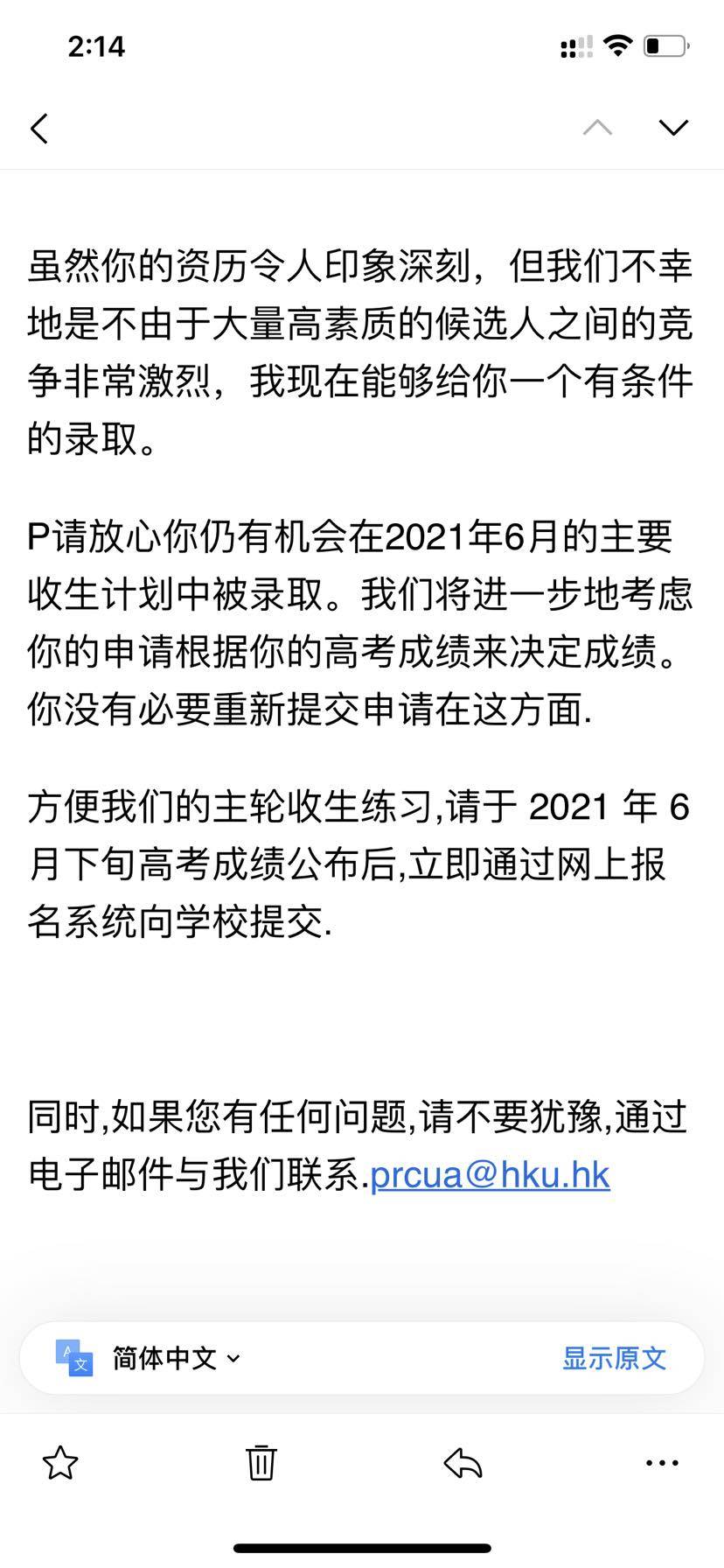 邮件是英文原文,用翻译软件翻成中文,机器翻译连语句都不太通顺。最终择校高考分数才是王道,高考加油吧。