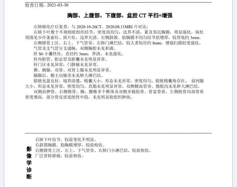 真不错,祝贺!请问你的中药还在继续服吗?我肺腺癌晚期,ALK突变,确诊后单吃阿来11个月,目前还行,复查结果每次均有好转,但与你相比,那可就差远了。我想了解一下你服中药的前后对比情况?