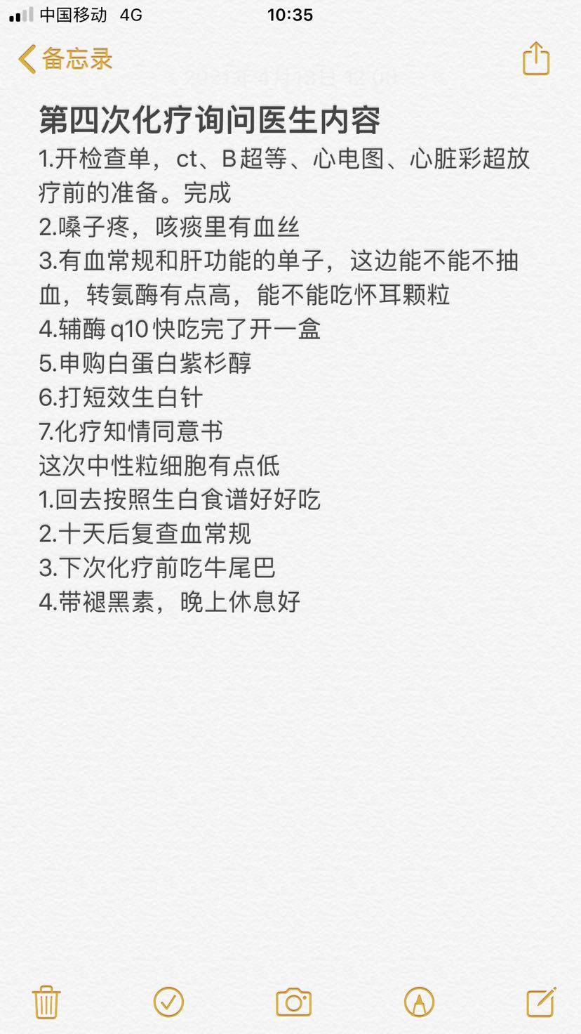 附一张自己的备忘录,怕有些事情忘记问医生,提前准备的。以及这次中性粒细胞低的一些改进办法。