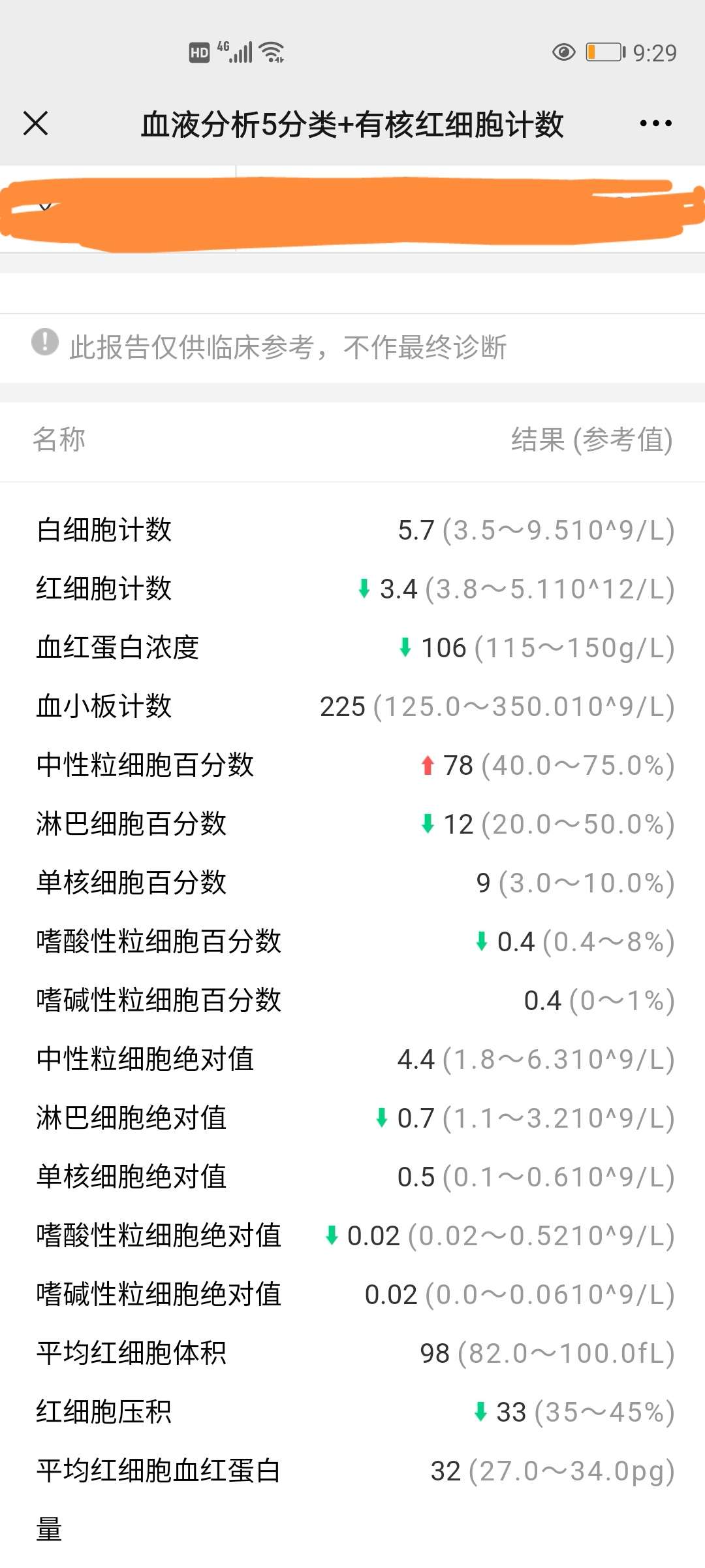 除了当天打完浑身虫虫爬感觉影响睡眠,其他都还好. 医生说不良反应一般发生在三四天后,因人而异. 今天工作的事情有点多才看今天的血常规报告,觅友帮忙看看,不懂. 因为还没有出院,不方便煮五红汤之类食补