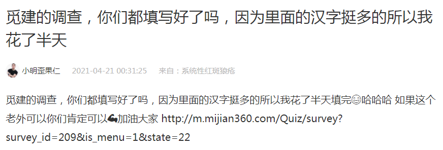 看到这几天有非常多的蝶友们都参加到这次问卷调查中来,大家用心令人动容,看到大家这种为自己战斗的决心,用自己的力量去推动SLE治疗的进步,圈主真是太感动了!!