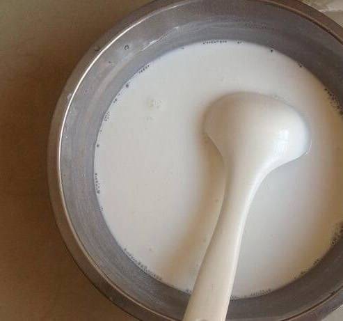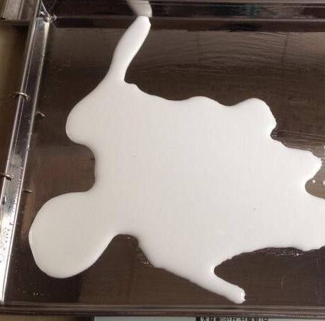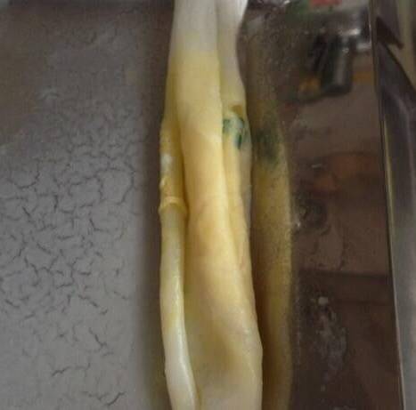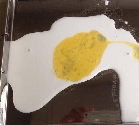 锅里的水烧开后,左右摇晃盘子,使肠粉盘里的粉浆,均匀铺满盘底。将肠粉盘放入锅中盖上锅盖,大约蒸3分钟,这个时候可以看到粉浆冒泡,拿起刮板将肠粉刮起放入盘中,