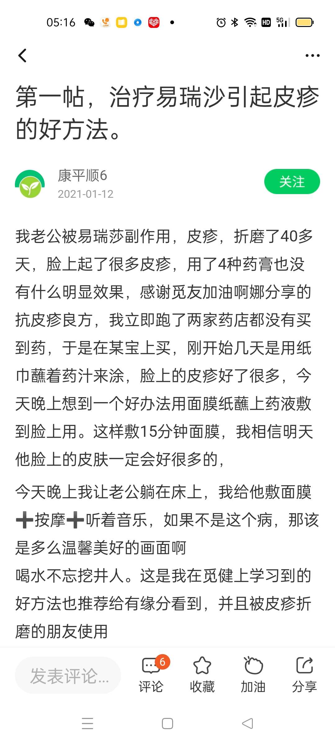 停药,从2月到现在老爸没睡过一个安稳觉,皮疹痒的不得安宁,医生最后采用激素疗法也压不下去,全身皮肤都快溃烂,今天入院医生还是采用激素再加丙球,希望能缓解老爸的皮疹,求助病友们有没有类似情况的麻烦回复,希望能帮助我爸减轻痛苦!