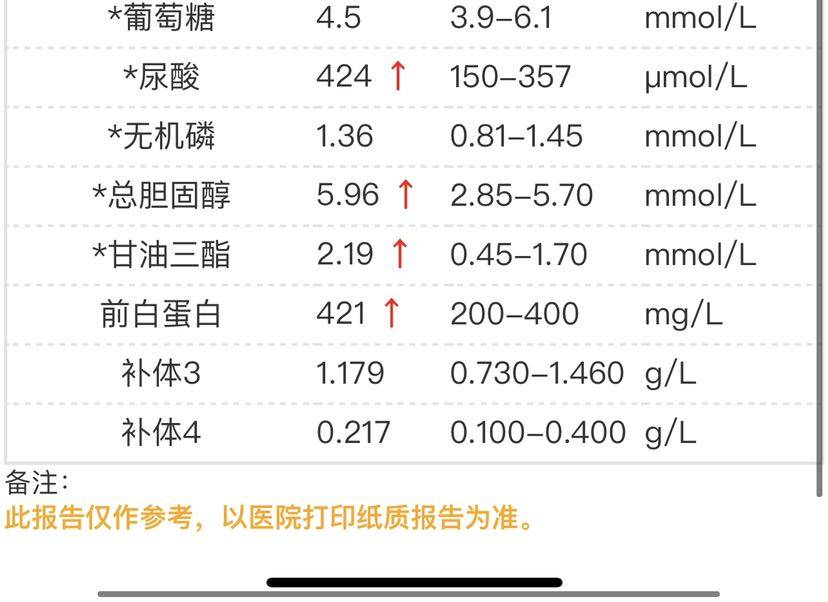 今天的化验抽了4管血 还有一个抗核抗体双项没出结果 那个要三个工作日。尿酸比上次高了 原因是这几天吃了肉 和动物内脏 。这能料到。其它各方面好像比上次的值低一些。尿还没验。这几天好好休息 好好验尿 不偷吃肉和动物内脏了 🧎♀️🧎♀️🧎♀️十分抱歉了 亲爱的自己...