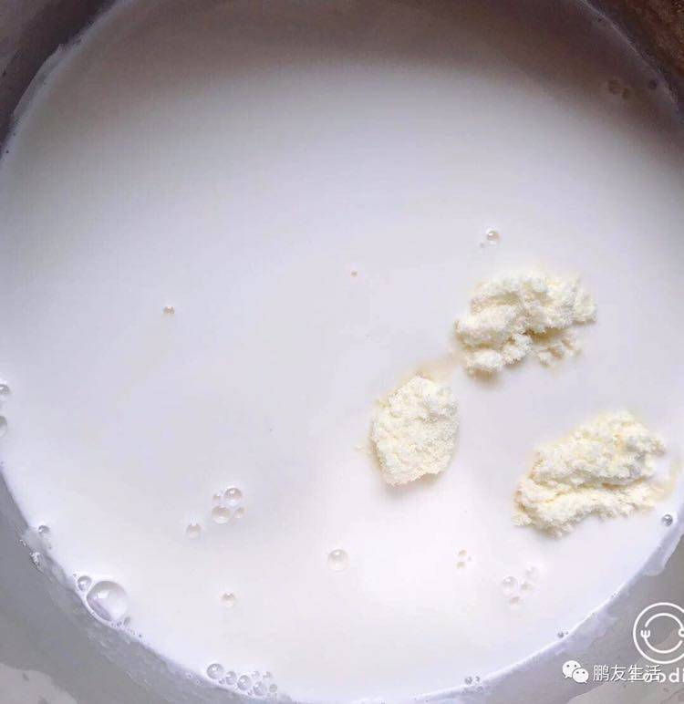 奶锅中倒入500ml牛奶稍微加热一下,然后倒入奶粉混合均匀,搅拌至奶粉完全融化。