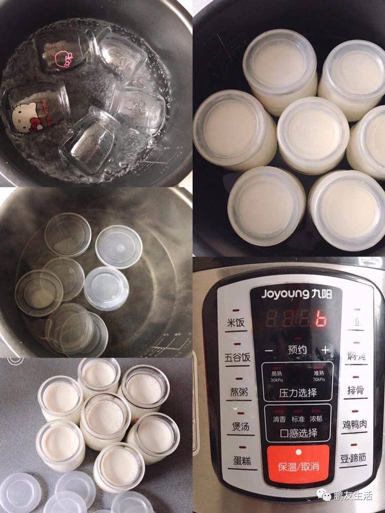 沸水消毒酸奶小瓶和盖子;量杯中的牛奶分装到小瓶子里;盖上盖子移入电饭锅(锅底加60度左右热水,水的高度到瓶身2/3)。保温档,6-8小时。