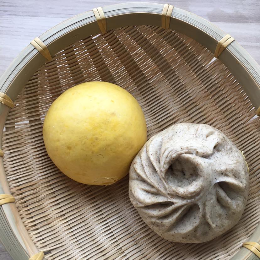 今天早餐,一个南瓜馒头和一个荠菜猪肉包子