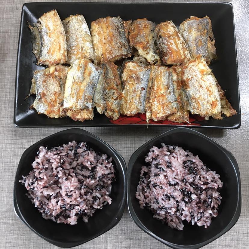 煎带鱼和黑米饭