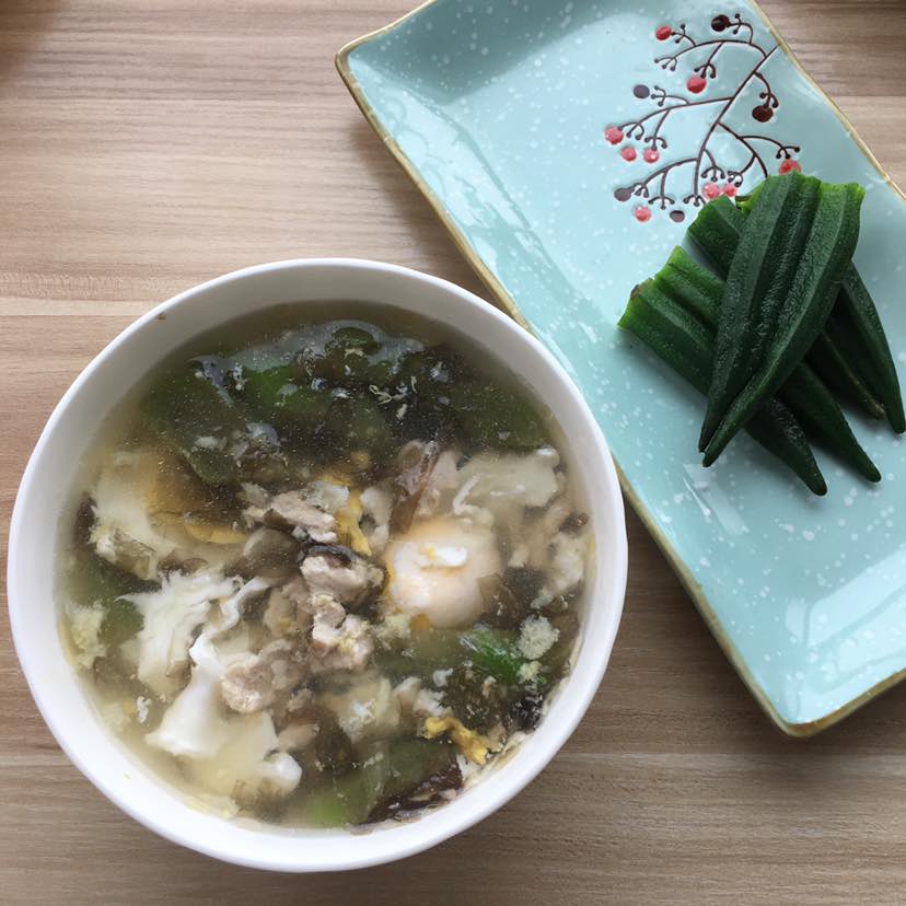 白灼秋葵,又做了一碗汤,肉片鸡蛋丝瓜紫菜汤。做法很简单,把肉切片放入锅中加少许姜丝煮出味道,然后依次加入丝瓜和紫菜。放入鸡蛋,我比较喜欢吃荷包蛋,所以不用打散。不放油,煮出来的味道香而不油腻。