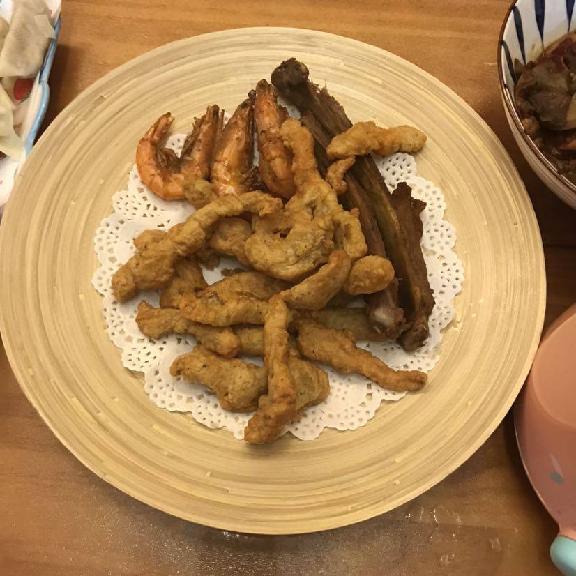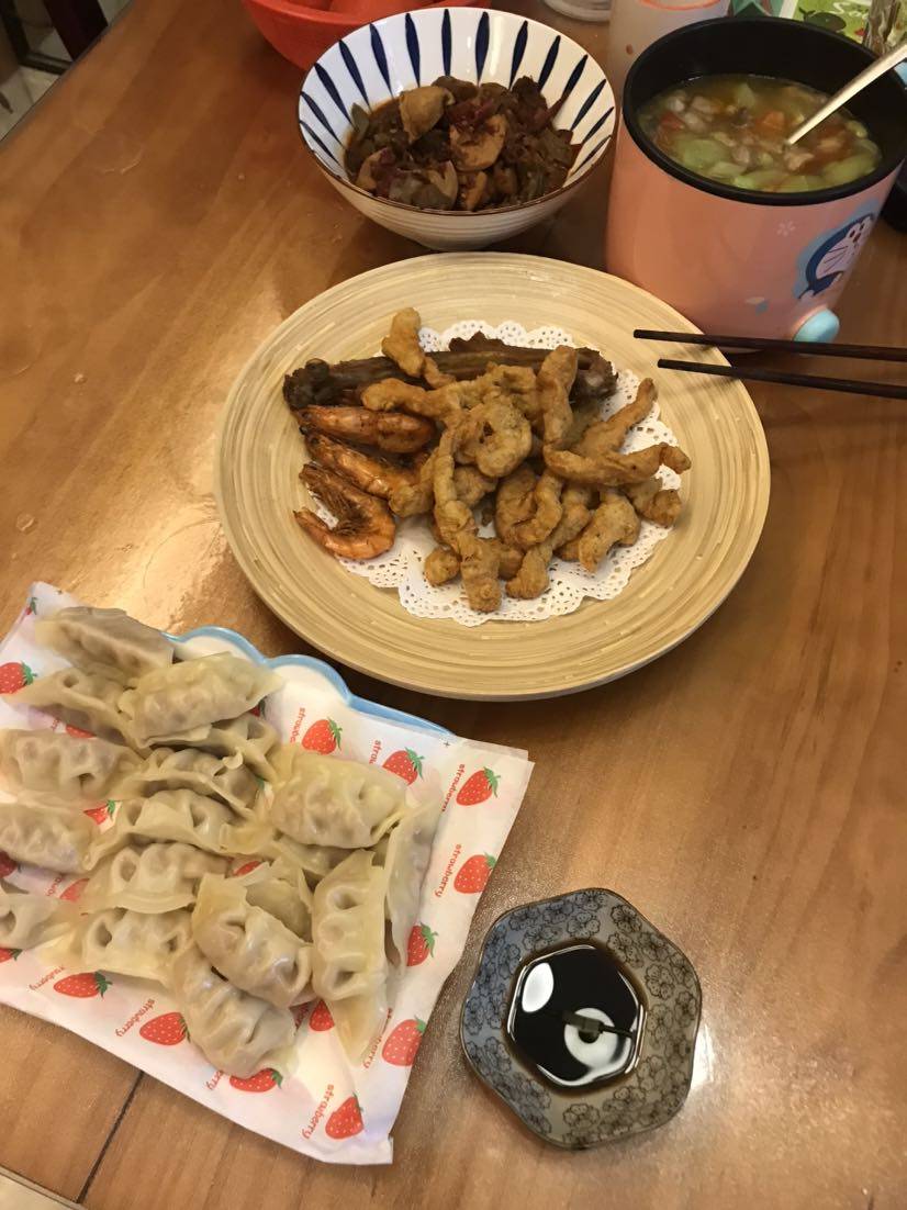 蒸了素三鲜饺子,蘑菇毛豆丝瓜汤,小酥肉,两根羊排,红烧牛杂炖面筋。。