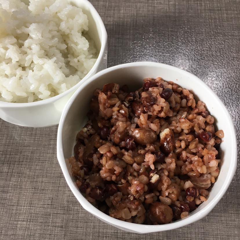 这是昨天午餐,我吃杂粮饭,老王吃肉必须搭配白饭。