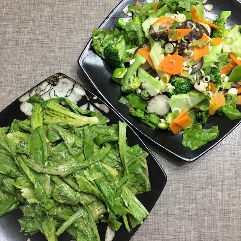 麻酱油麦菜和橄榄油拌合菜:有生菜,青椒,香菇和西兰花🥕