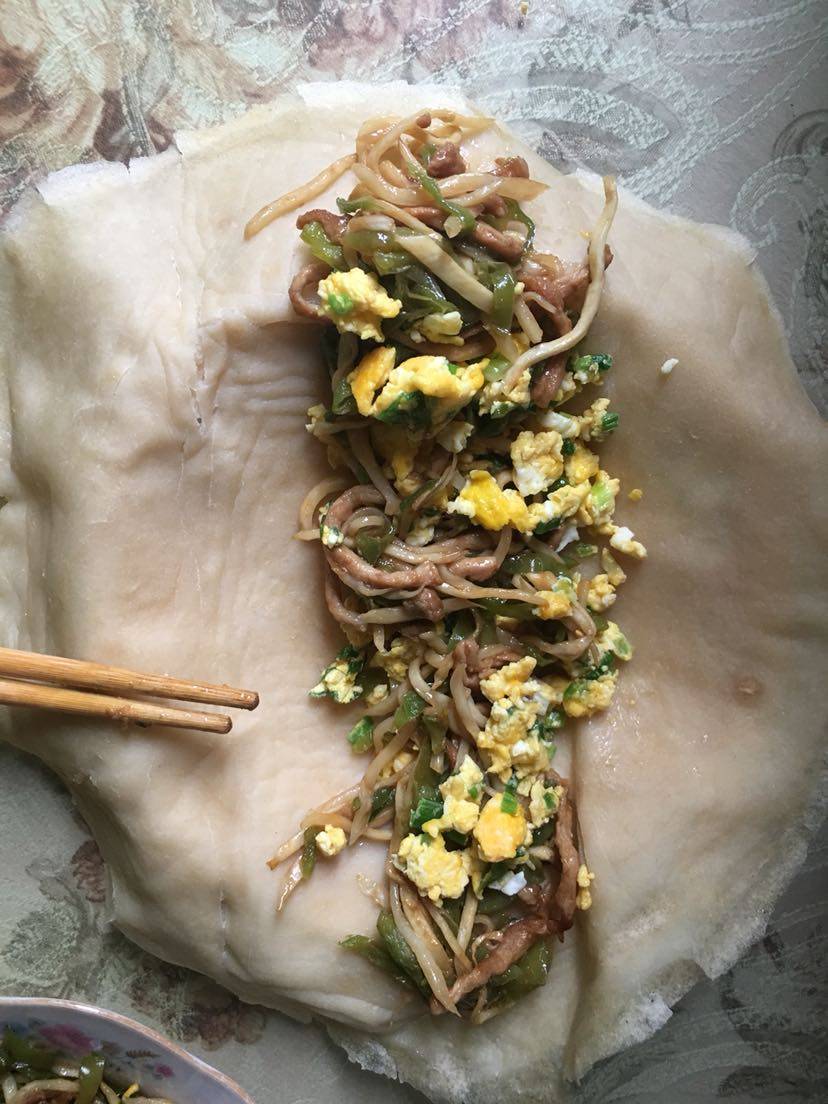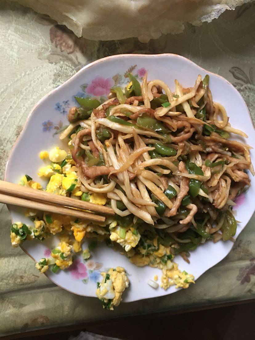 大家早上好!昨晚下了一夜的雨,现在小雨还在继续,凉爽了很多,又是一个普通的日子,今天的早餐,自己摊的高筋全麦面粉混合的煎饼,裹了鸡蛋、茭白肉丝炒青椒,一小碗白合汤,简单的生活从早晨开始,加油💪