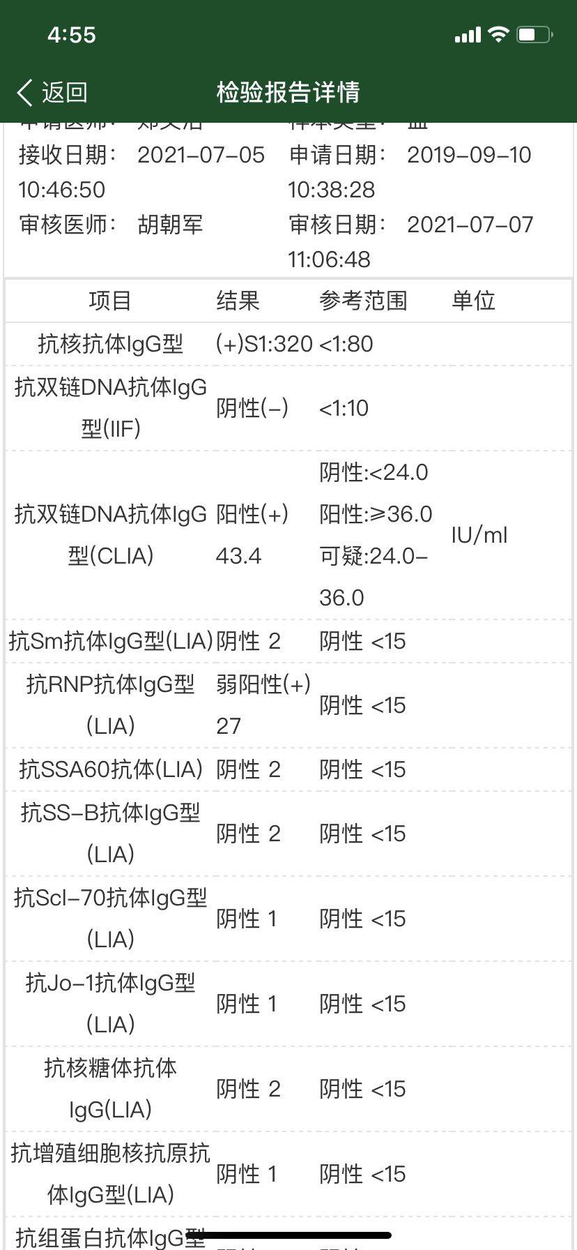 因为新冠病毒的影响,距离上次在北京协和做检查已是两年前的事了,这次去把化验做了,在出结果前,我自己感觉身体好像有些异样,果然,以前从未出现异常的抗双链DNA阳性了,血常规的箭头像下雨一样,还有碱性磷酸酶和前白蛋白也出现了异样 。不知道是岗位调动累的还是因为打了疫苗的原因,好想快点去见医生,不想复发,确诊到现在虽然没经历过复发可是通过病友们的描述,感觉复发就是更深层次的伤害,而且这个伤害很多是不可逆的。这个暑假注定要与医院打交道了,下周我的主治医生好像还停诊了,现在也不知道能不能加上号,看病太难了!祝自己好运