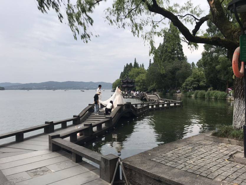 周六没太阳,微风吹着,我们两还去逛了西湖,去看了当年跟董浩叔叔拍婚纱照的地方,一转眼十一年过去了,风景还在,人已不同了。