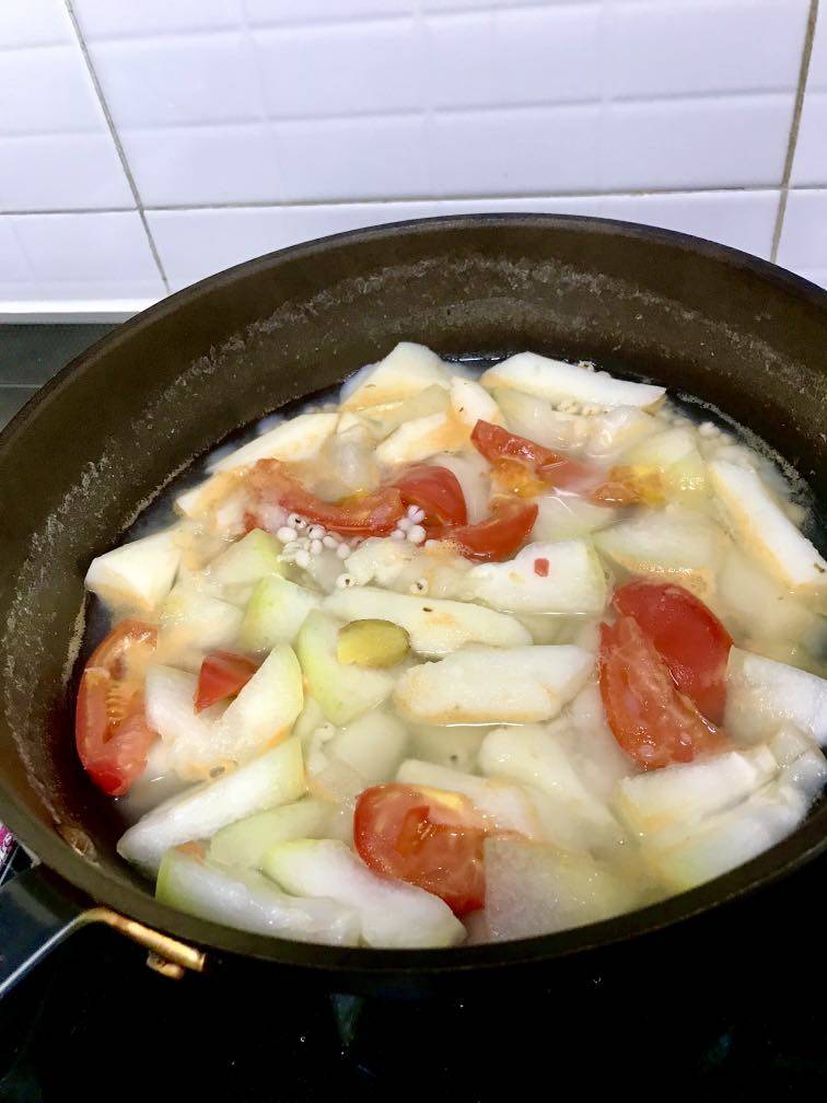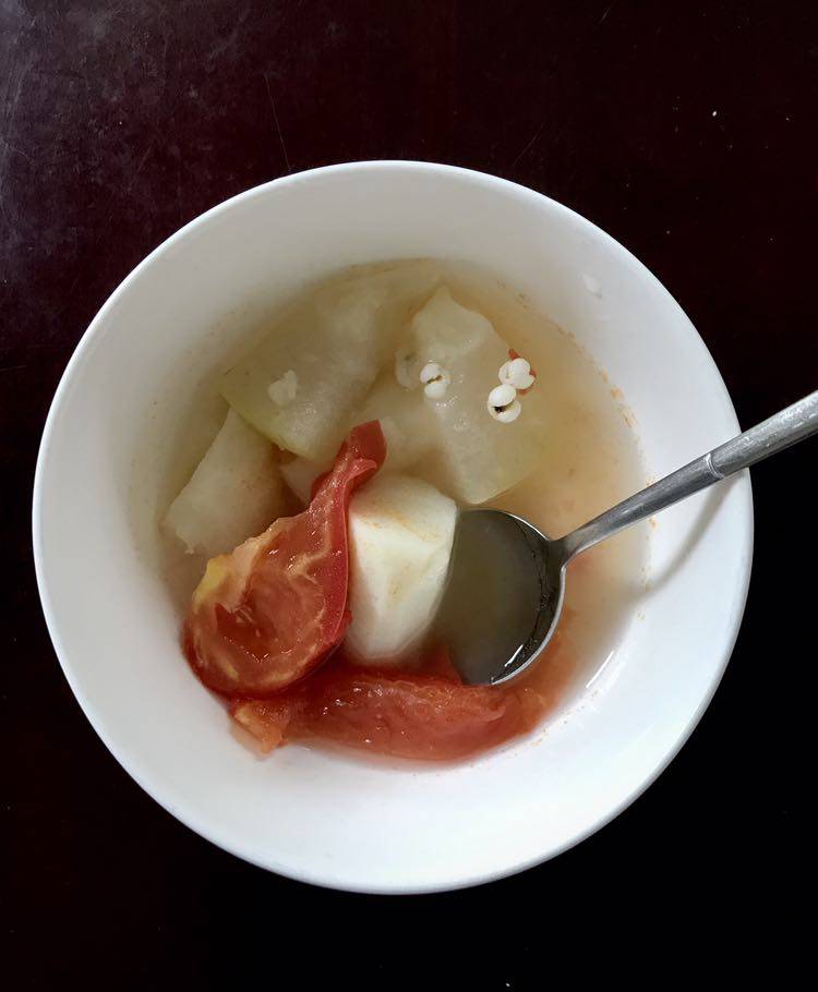 薏仁米(提前泡),山药,冬瓜,姜片,西红柿,顺序下锅煮,最后点少许盐。