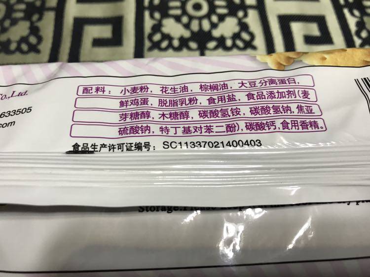 首先来看配料表:小麦粉排首位(饼干嘛,当然面粉是大头)其次列出了添加的油脂是花生油、棕榈油,让消费者心中有数。