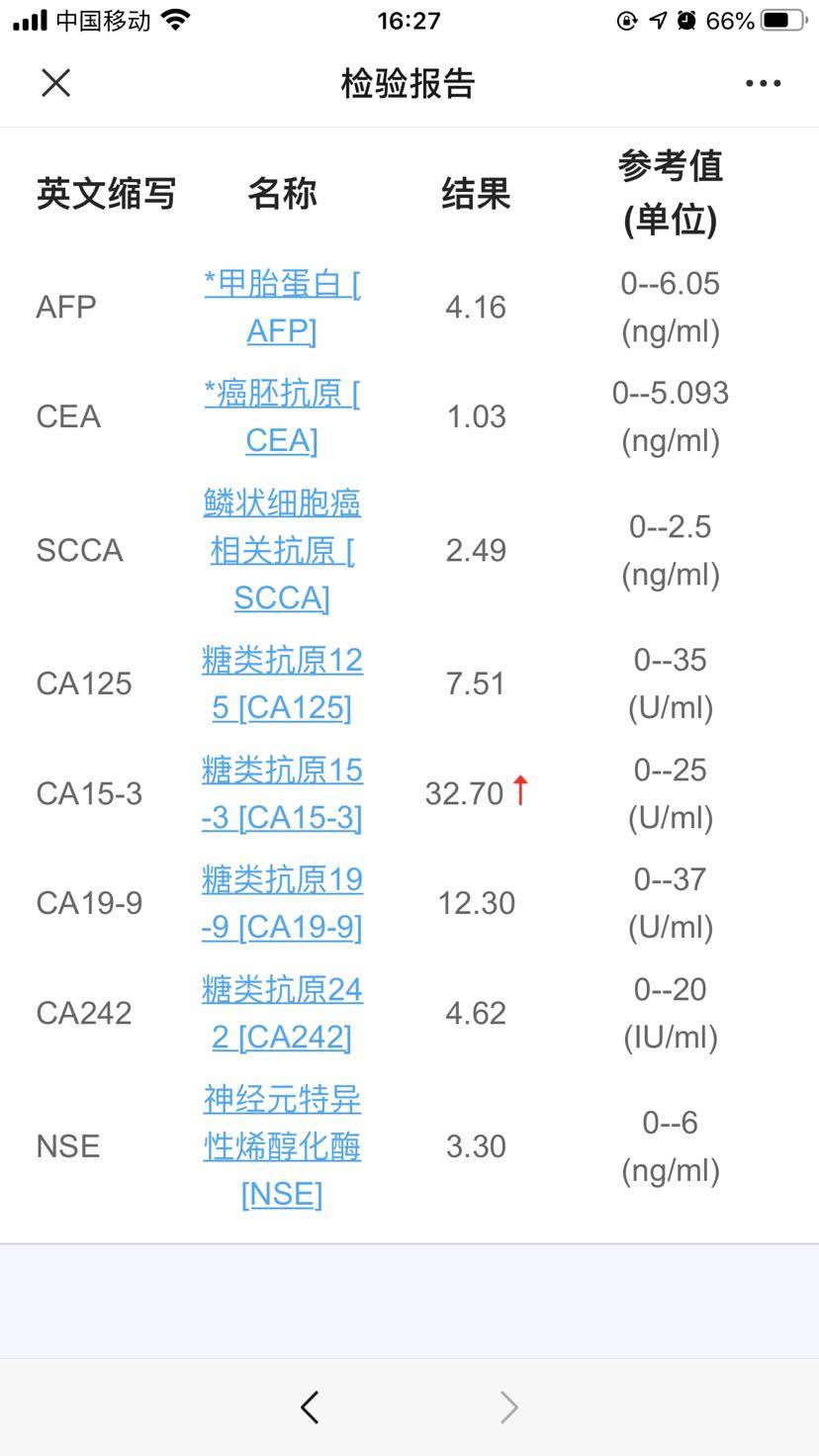 同时肿瘤标志物中糖类抗原15-3也偏高,32.7正常值是0-25。