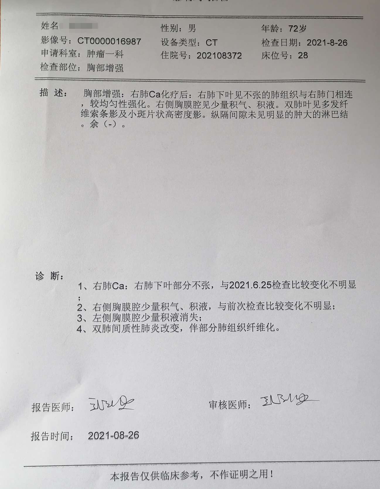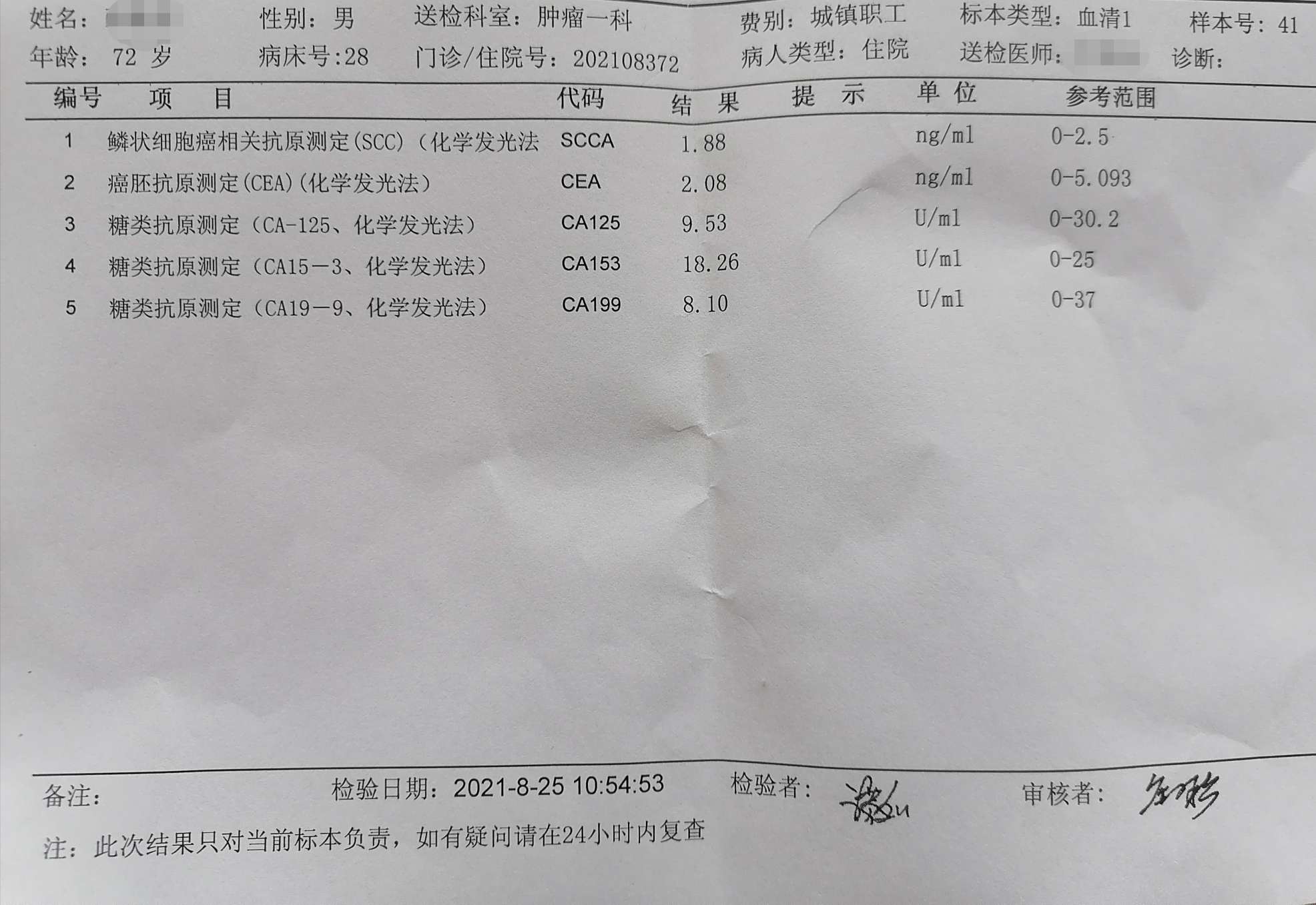 最近两天在医院复查,血常规,肝功五项,肿标都正常了,今天做的增强CT结果也出来了,一切正常。暂停治疗回家快两个月了,爸爸情况一天天变好,希望一直保持。目前大夫说身体还是有炎症,C反应蛋白有点高,是肺炎?插管后气管发炎没好?明天去医院找主任问问情况。