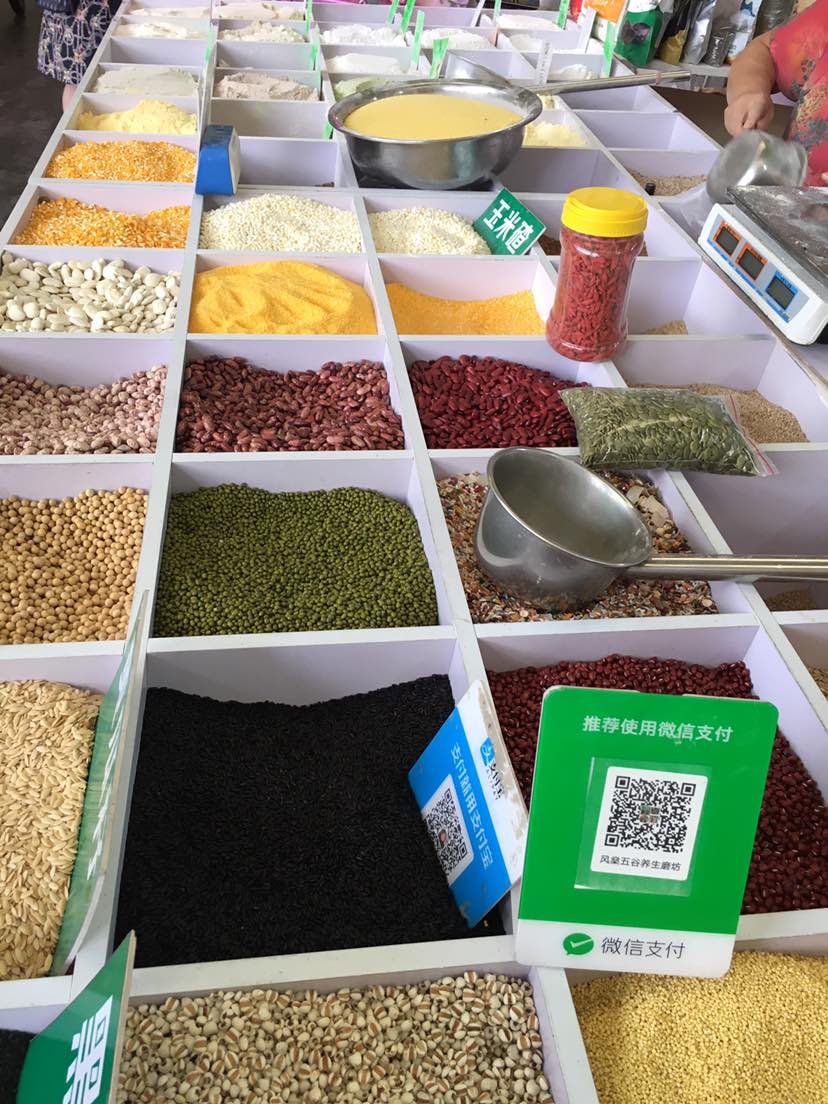 今天早上去农贸市场买杂粮,每样买两斤。