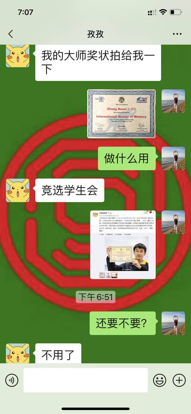 今天儿子让我把他的大师证书发给他,原来是为参加学校学生会竞选,也是大一的学生有这种激情吧,一切都很新鲜,什么都去争取和参与。十天了才和我视频连线一次,学校的伙食果然好,看他的脸还圆润了不少。我们娘俩都在长肉肉。