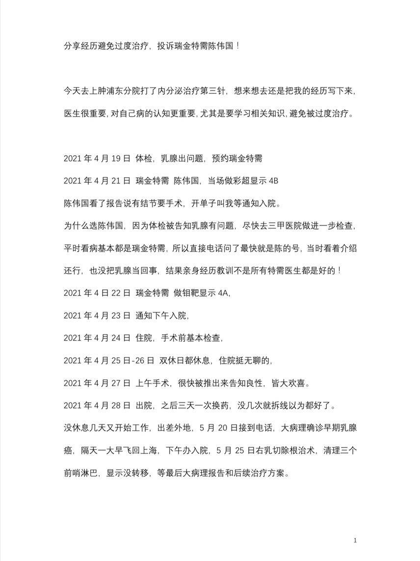 分享经历避免过度治疗,投诉瑞金特需陈伟国!