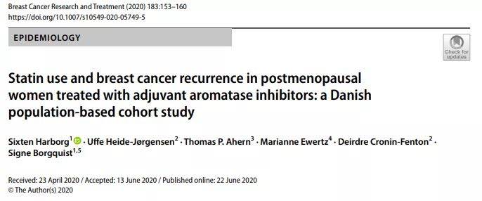 2020年6月22日,施普林格自然旗下《乳腺癌研究与治疗》在线发表一项研究报告,针对丹麦全国乳腺癌术后芳香酶抑制剂辅助治疗绝经患者人群,检验了他汀类对乳腺癌复发风险的影响。该研究结果表明,对于早期乳腺癌术后芳香化酶抑制剂辅助治疗的绝经患者,服用与未服用他汀类降脂药物的患者相比,乳腺癌复发风险总体较低。