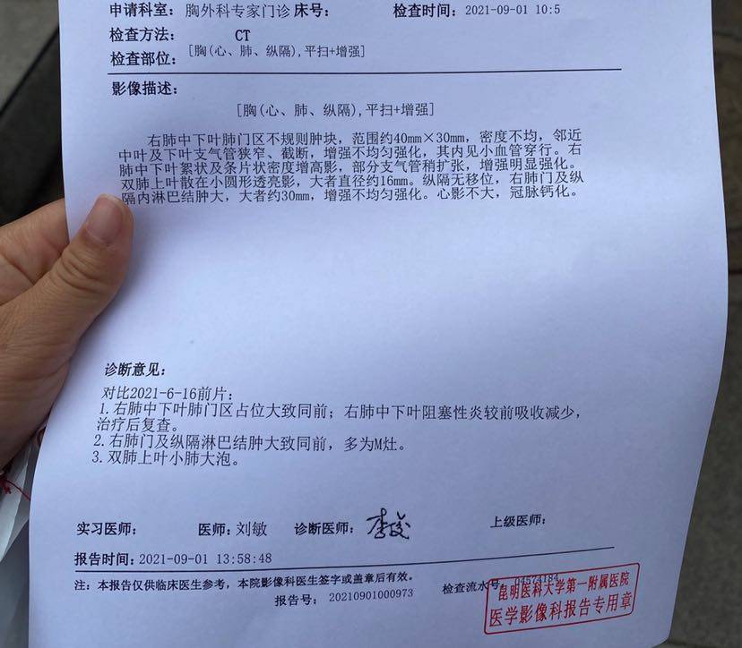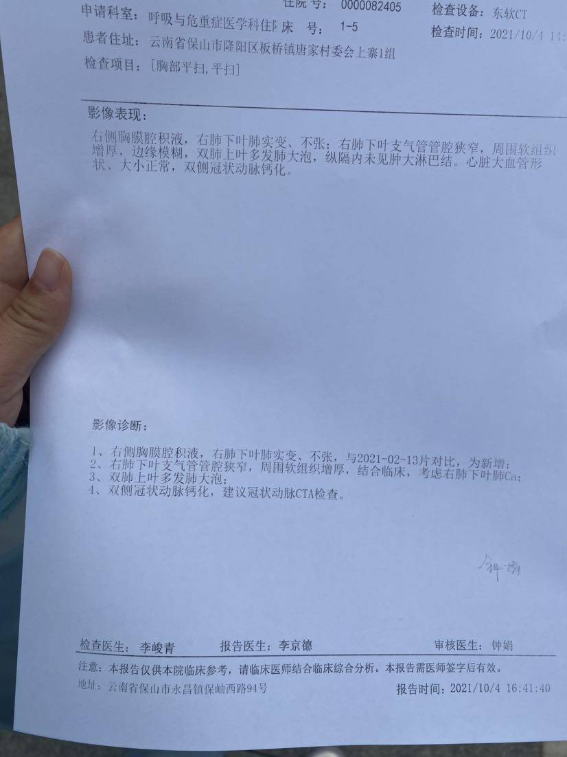 20211004在当地继续第二次信迪利单药维持,医生建议拍CT了解情况,结果显示右侧胸膜腔积液,右肺下叶实变、不张,与0213片子对比为新增。病人体感很好,医生建议先观察,这几天心里很担忧….