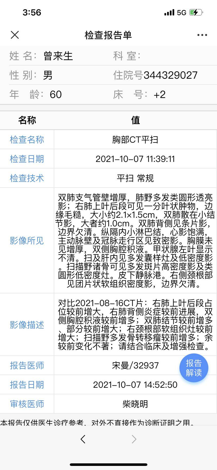 父亲下午突然呼吸不畅,喉咙有呼噜声的痰,血氧突然81,心率125,迅速吸氧,氧气越开越大,已经开到10,全身汗水不停流,同时加雾化舒瑞坦,注射静脉祛痰药。父亲肺腺癌晚期,经历过pd1免疫治疗和肺部放疗,由于临时突然没去拍ct,不清楚是否是肺炎,如今一整夜两次~3次雾化。医生说很危险,做好准备。请问大家还有什么好意见能救救父亲。才60岁生日刚过。苦累一辈子才刚熬到退休,看着他,实在难忍。以下是刚7号做的ct,及生化单。提前叩首谢谢