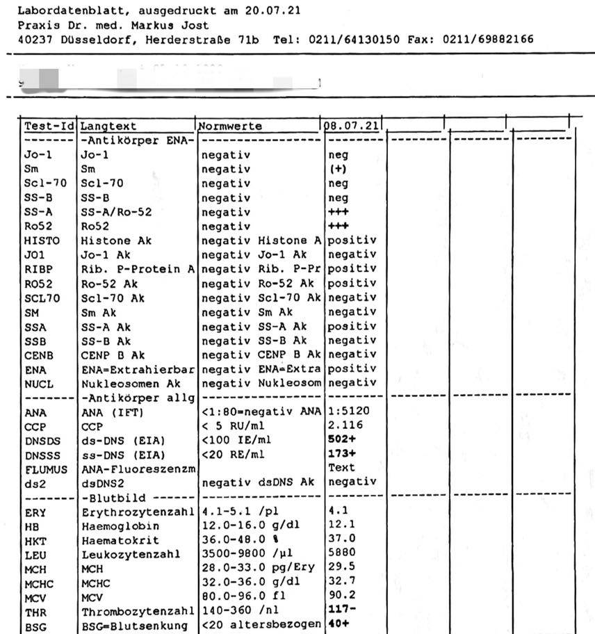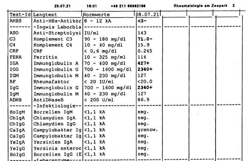 8月刚到,我就打电话询问检查结果,然后风湿科诊所的前台阿姨让我去我的家庭医生那里取结果,并表示检查报告7月20号已经送到家庭医生处了。(我听完都懵逼了,德国看个病大概能写出一篇论文那么长的吐槽贴子吧!难怪歪果仁都是铁打的。。。)