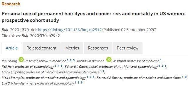 202092日,一项关于美国女性使用永久性染发剂与致癌风险相关性的研究发表在著名期刊的BMJ上。研究通过对117200名妇女36年的跟踪观察研究得出结论:
