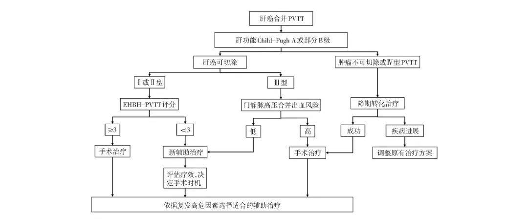 与Ⅰ、Ⅱ型比较,Ⅲ、Ⅳ型病人的疾病分期更晚、病情恶化更快、手术治疗的机会更小。对于不可切除的肝癌合并PVTT的病人,临床上还在寻找有效的治疗途径。目前主要还是降期转化的治疗理念,或者利用靶向药物或免疫药物改善病人的总体生存时间和疾病无进展生存时间,例如索拉非尼联合HAIC(FOLFOX方案)[9],纳武利尤单抗等PD-1药物、阿替利珠单抗联合贝伐珠单抗(T A)方案[10-11]。