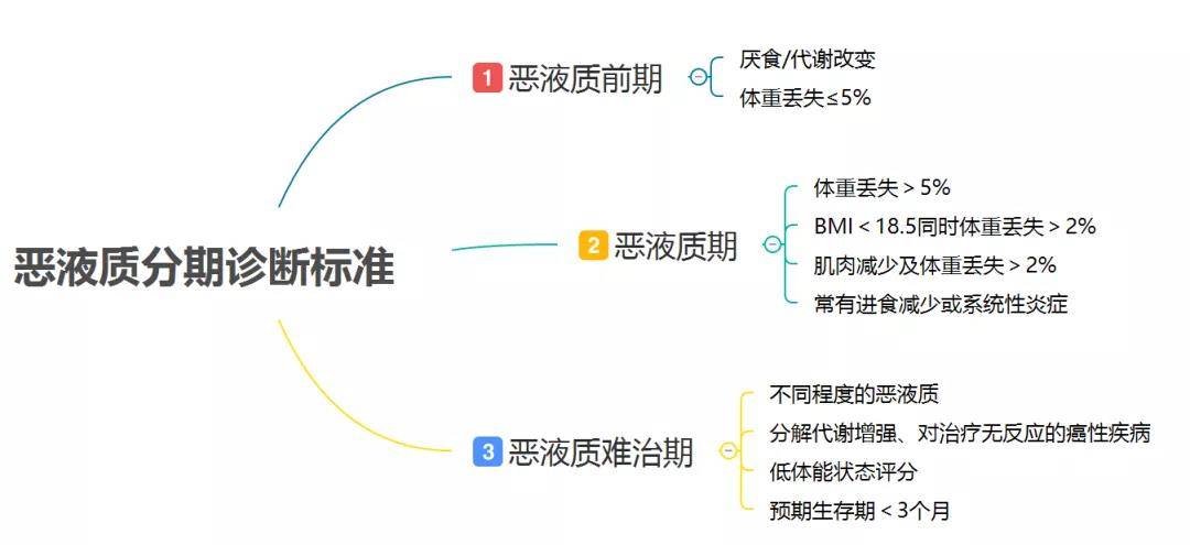 《欧洲肿瘤恶液质临床指南》中将恶液质分为三期:恶液质前期、恶液质期、恶液质难治期。