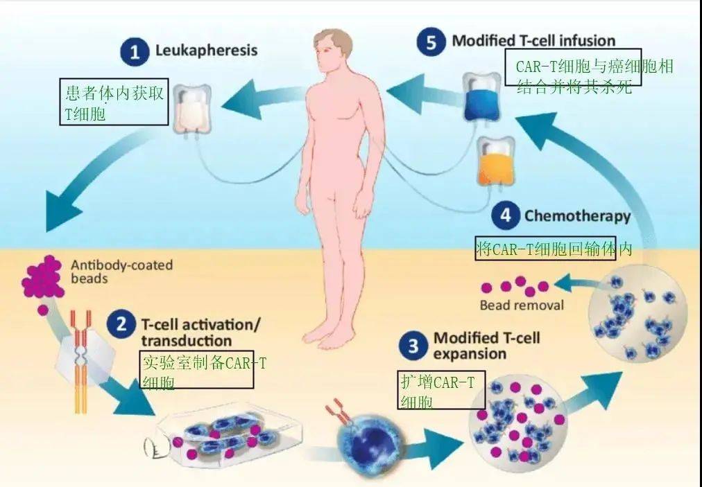 与化疗、靶向治疗、免疫检查点抑制剂(如PD-1/PD-L1抑制剂)等的治疗方式不同,CAR-T疗法需要将患者体内的T细胞取出,在体外进行改造,之后再将改造后的T细胞回输患者体内。