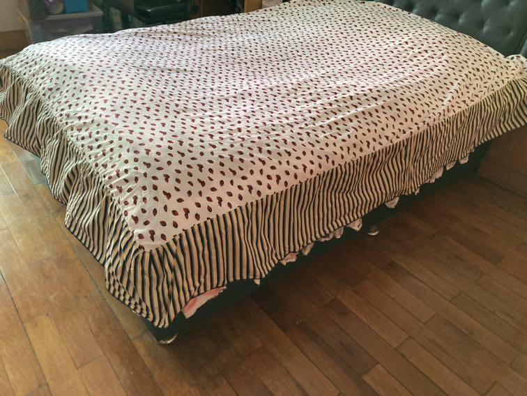 一直觉得这两块布拼一起不好看,所以都不愿去搞它,家里堆积的东西实在太多,丢又舍不得,昨天看到了这些东西,心想还是处理一些算一些吧,拼起来后感觉也没这么难看,马马虎虎,平时就做床单用。