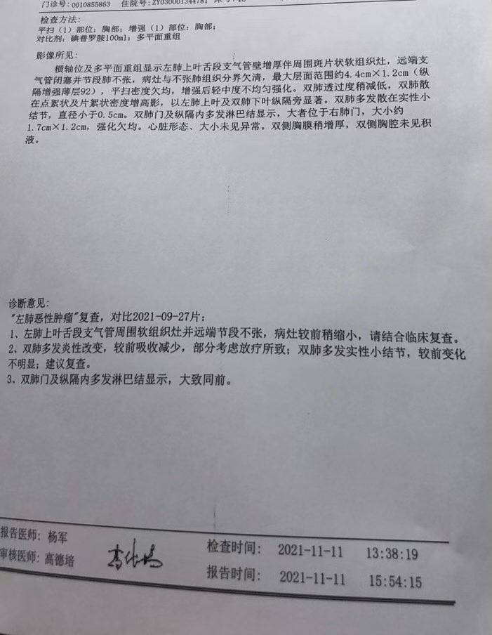 妈妈患肺癌已经有三年了,这三年来一直在接受治疗到现在,下面是妈妈检查以及治疗的过程。2010年10月,妈妈体检出肺癌IV期,纵隔淋巴转移,肝部转移,去省肿瘤医院复查,做了PET-CT,结果一样,省肿瘤