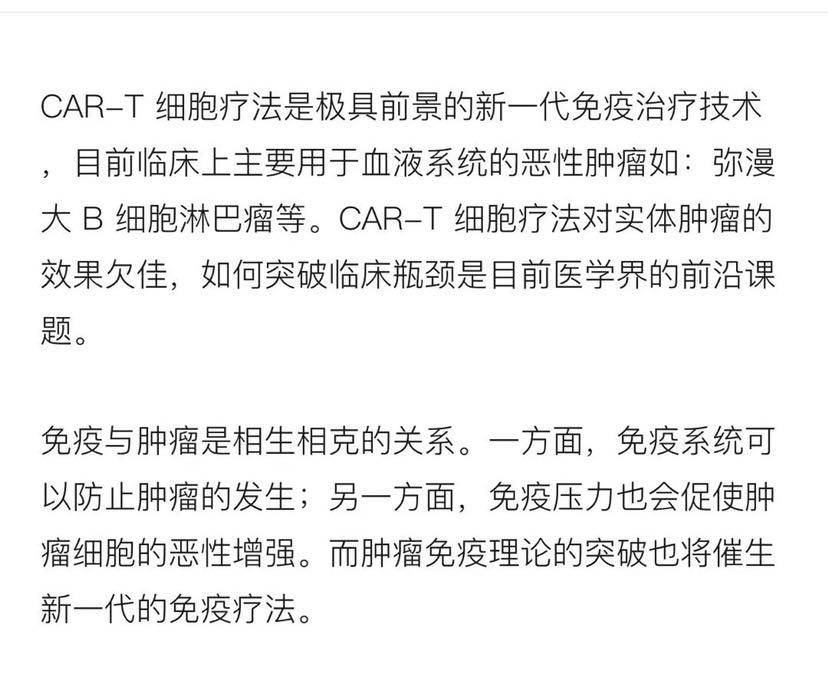 现在有更先进的技术car-t只能找到1-2个靶点 复合细胞nkt可以找到十几个以上,产生抗体就是根治了 上海有成功案例