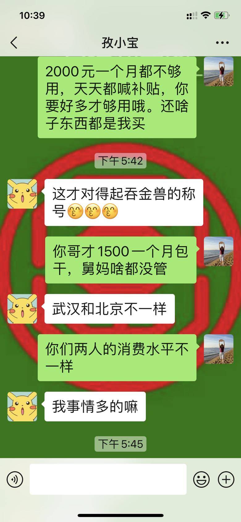 家里那只吞金兽每天一个电话和我们联系,一般吐槽大学还忙得不行之类的,能和父母唠唠嗑也是一种减压吧。最近他天天说要改善伙食,要求给补贴。