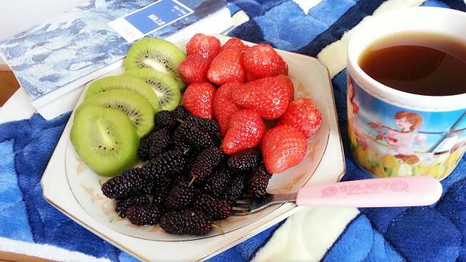 晒着太阳,吃着水果,看着书,真的很幸福!