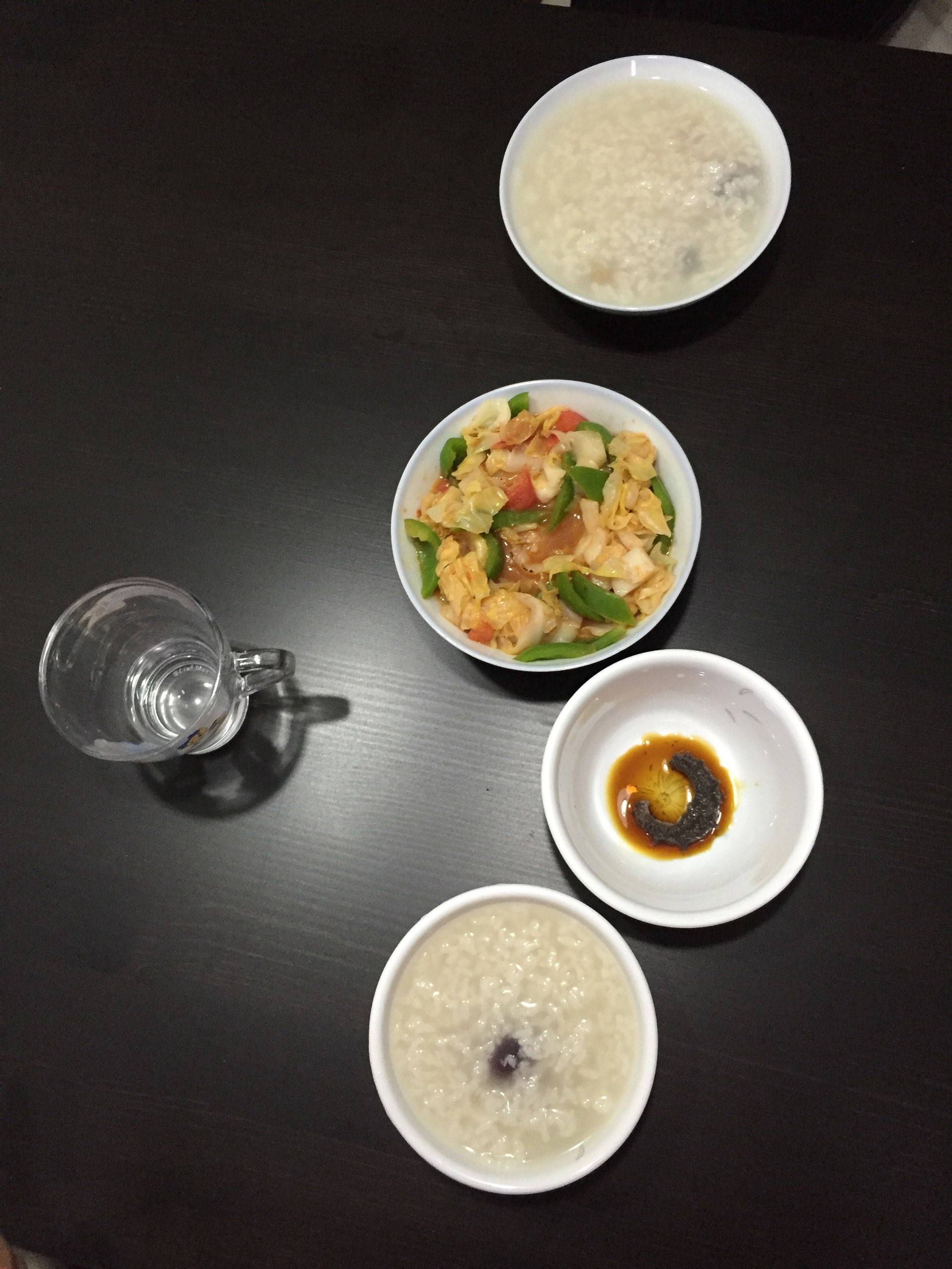 早上特简单,西红柿炒包菜,半根海参,一碗红枣米粥。