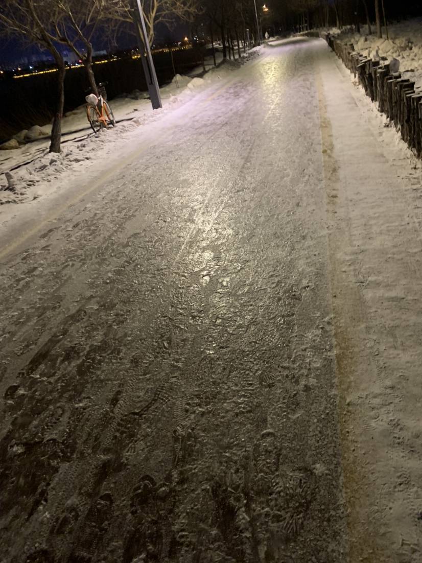 昨晚下雨☔️,今早下雪❄️,道路亮闪闪。