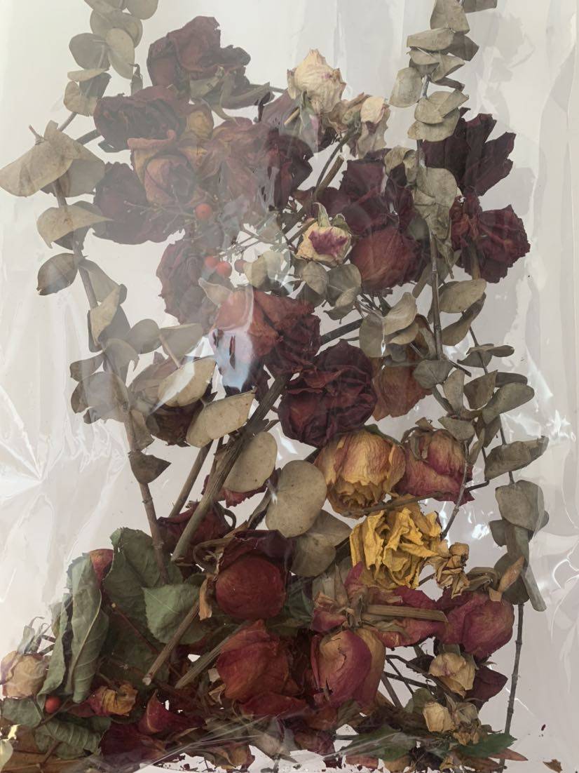 花瓶的干花摆了很久了,非常干脆了,这是妹妹在我三疗的时候送给我的,那时候还是夏天,我的所有不良反应来自于气味,每天闻着花香的味道会舒服很多,尤其是我钟爱的玫瑰,花凋萎了我也舍不得扔,晒成干花插在花瓶里面,就这样伴着我走过所有的疗程。今天收拾家务,发现花朵上积灰不少,那些粉色玫瑰全无颜色,就像枯蝶,而红色玫瑰还是那么刚烈绚丽,拿剪子剪下来红玫瑰花朵,全部收集在一个好看的手提袋里,填满后,又是一幅美丽作品,我喜欢这红玫瑰的热情,一如我们对生命的热爱和执着!抛开娇弱和怜惜,热烈的、一无所惧的向前看,每个灿烂的日子都要珍藏!