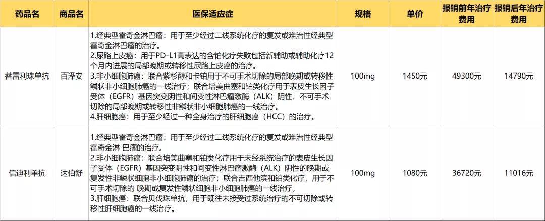 而经过医保报销后,王叔叔单疗程费用为1450*2*30%=870元(按照报销比例为70%来计算),相比之前,自付费用整整降低了80%!其中,替雷利珠单抗单支价格仅需435元!