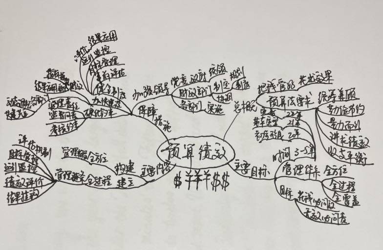 今天又是一天关门开会,上午正式大会,开幕式,听报告,下午参加预算专题审议。不懂就学,今天学习了预算绩效,还拾起了久未用过的思维导图,可惜没有彩色笔,不然能画漂亮一点。学过的东西久不用,总会生疏。图像记忆比文字记忆深刻一点,思维导图应该是学习的好帮手。