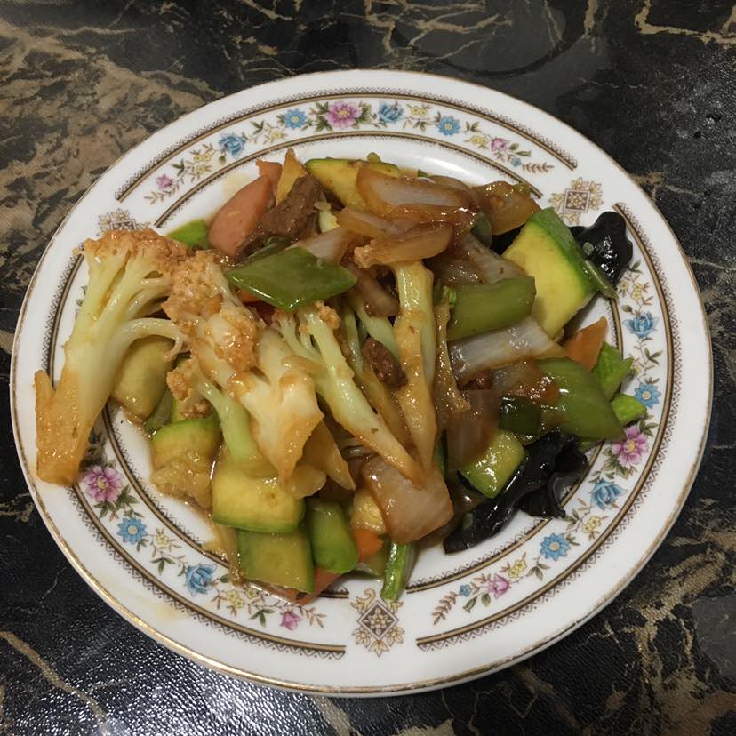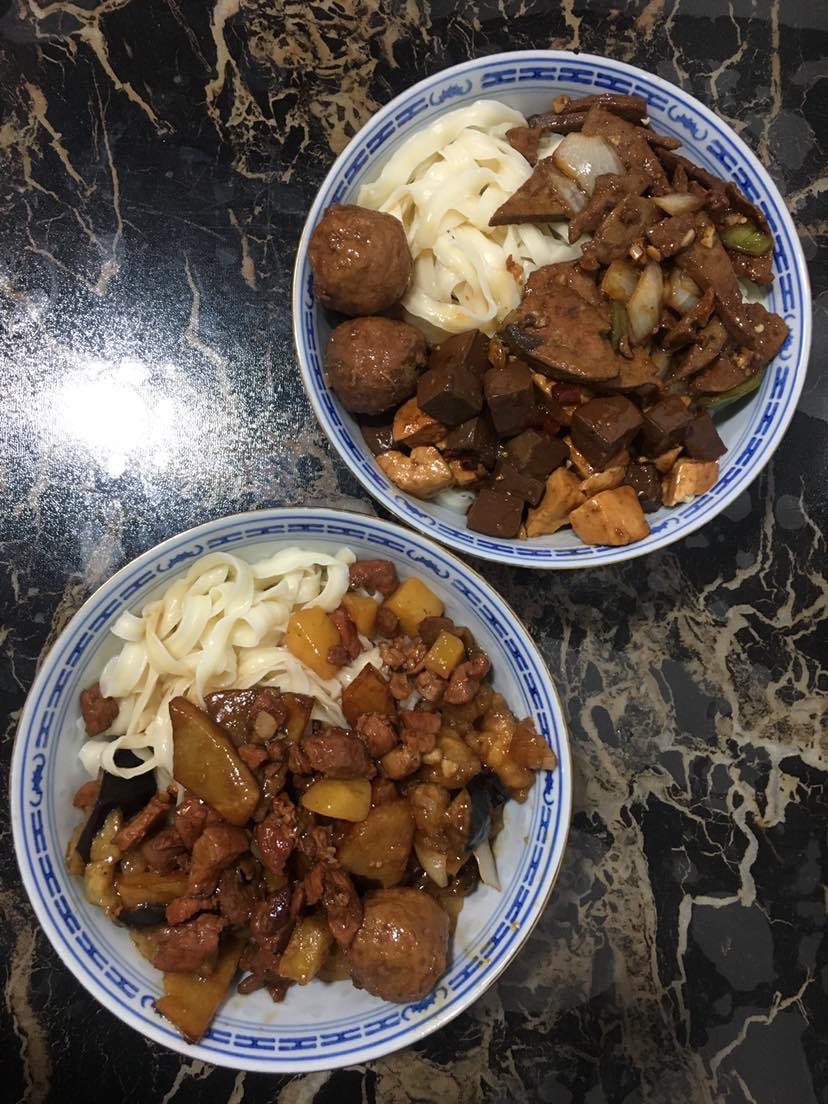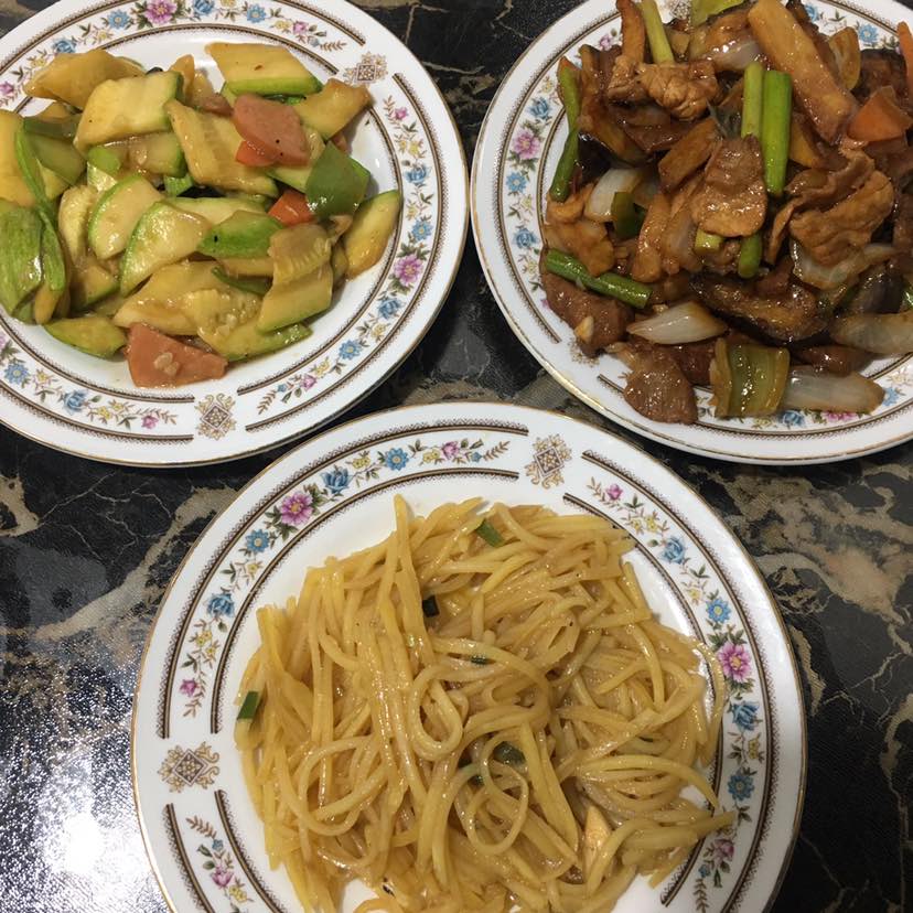 19号早中餐:角瓜炒火腿肠和土豆丝,茄子蒜苔洋葱青椒炒肉